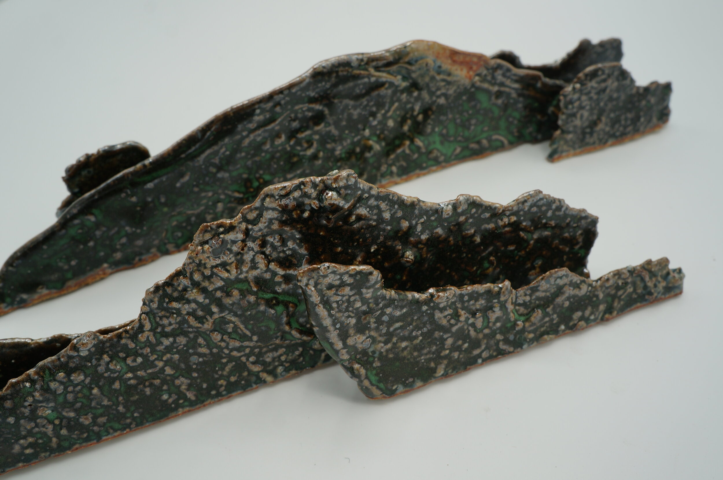 Tabletop landscapes made of clay, sand, earth, glass and found objects.